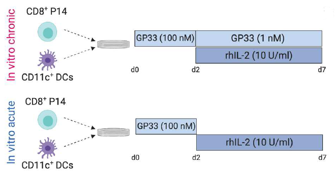 Subsequently, the in vitro depletion model was sequenced to probe its transcriptional and epigenetic features. RNA-seq results showed consistent chronic and acute model mapping with only 634 differential genes and 2844 differential genes at d7, suggesting similar initiation progression but differentiation at d7, where acute stimulation of P14 cells biased the Tmem phenotype and the Tex phenotype in the acute model. In gene enrichment analysis, genes upregulated by Tex in vivo were heavily enriched in P14 cells in the chronic model, and these genes were associated with negative regulation of T cell activation. In the ATAC-seq assay for epigenetic features, P14 cells in both models co-colocalized with Tex at d4, possibly related to the activation of relevant chromatin accessibility. Consistent with transcript levels, both showed a similar initial pathway as well as differentiation at d7.