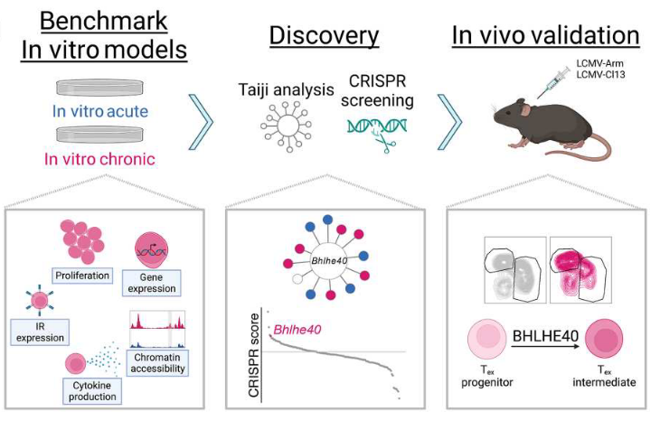 After proving that the chronic stimulation model in vitro can reflect the characteristics of Tex in vivo, the researchers used CRISPR screening in the hope of identifying relevant transcription factors that regulate the process of Tex. The results showed that BHLHE40 was highly expressed in the chronic model and did not appear in the acute model, suggesting that it may be closely related to T cell exhaustion.