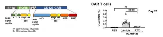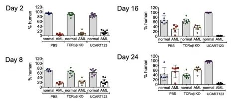 Finally, the authors established a competitive NBM/AML model in which leukemia cells compete with normal hematopoietic cells to simulate what occurs in leukemia patients. found that in a competitive NBM/AML model, UCART123 preferentially targeted AML cells and significantly eliminated AML cells on day 16 after treatment.