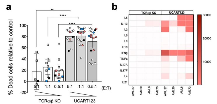 The authors confirmed the specific antitumor activity of UCART123 against CD123+ primary AML samples by in vitro cytotoxicity assays and colony formation assays. UCART123 induced specific lysis of all AML samples tested. In addition, we found that several cytokines, such as IFN-γ, IL-2, IL-13, TNF-α, and IL-5, were produced when UCART123 was cultured with all acute myeloid leukemia samples. Importantly, primary leukemia samples were unable to form colony units after UCART123 treatment, indicating their ability to eliminate leukemic progenitor cells.
