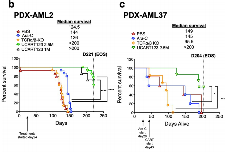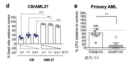 In summary, the authors used primary AML samples, normal bone marrow (BM) and cord blood (CB) cells, patient-derived xenografts (PDX), normal bone marrow (NBM) humanized xenografts (HU-X) models and competitive NBM/AML xenograft model to test the activity of UCART123 in vitro and in vivo. Data show that UCART123 can eliminate LSCs and preferentially eliminate AML cells in vitro and in vivo without significant effects on normal cells, which is expected to prevent the recurrence of AML leukemia.