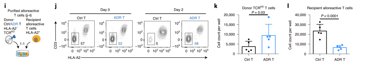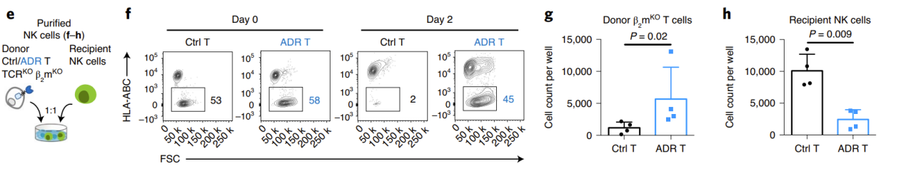 Next, the researchers used the mixed lymphocyte reaction (MLR) model to uate the ability of ADR T cells to eliminate allogeneic killer cells and resist immune rejection in vitro. To minimize GvHD, the researchers knocked out the donor TCR. In the NK-mediated immune rejection model, the researchers simultaneously blocked the β2m of the donor T cells, causing the loss of MHC-I molecules, thereby inhibiting T cell recognition and promoting NK cell activation. The results showed that on days 9-12 of co-incubation with allogeneic immune cells, the donor T cells in the control group were eliminated, while the ADR T cells significantly expanded. At the same time, the receptor lymphocytes in the ADR T cell treatment group were significantly controlled (Figure 2).