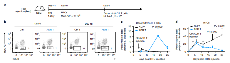 Subsequently, the researchers established a mouse model of allogeneic immune rejection. They first used a semi-lethal dose of rays to eliminate mouse lymphocytes, then reinfused recipient T cells or PBMC, and 4 days later, reinfused allogeneic donors. cell. At 18 days/14 days, the donor cells in the control group had been completely eliminated, while the ADR T cells expanded significantly and effectively resisted immune rejection by allogeneic T cells and NK cells (Figure 3).