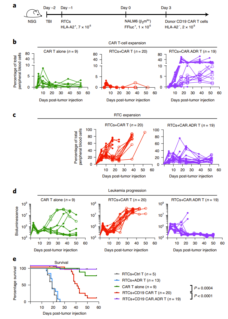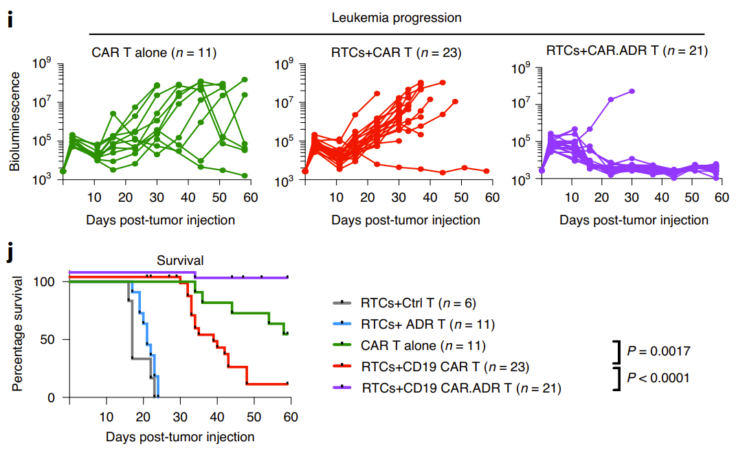 The researchers also established a B-cell lymphoma model based on the animal immune rejection model. They found that in the absence of receptor T cell RTCs (i.e., immune rejection), CD19 CAR The T cells were able to eliminate pre-established tumors in most mice and for a long time. However, in the presence of RTCs, CD19 CAR T cells are rapidly rejected in 95% of animal models, leading to the expansion of RTCs in peripheral blood. CD19 CAR-T cell therapy only exerts anti-tumor effects in a short period of time, followed by rapid recurrence of cancer in almost all mice and eventual death. . However, in CAR ADR T cell therapy, the CAR in the peripheral blood of RTCs-treated mice T cells proliferated significantly, and RTCs were observed to exhibit significant inhibition. This treatment method fully controlled the progression of lymphoma, and the survival period of mice was significantly longer than that of other groups (Figure 5).
