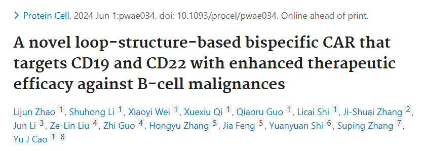 近期,深圳凯发K8研发部部长赵丽君博士以第一作者、北京大学深圳研究生院曹宇教授为通讯作者,在国际知名期刊《Protein & Cell》(SCI一区期刊,影响因子13.6)上发表论文“A novel loop-structure-based bispecific CAR that targets CD19 and CD22 with enhanced therapeutic efficacy against B-cell malignances”。而这项工作正是细胞治疗中基础研究到工业转化到临床应用的优秀案例。