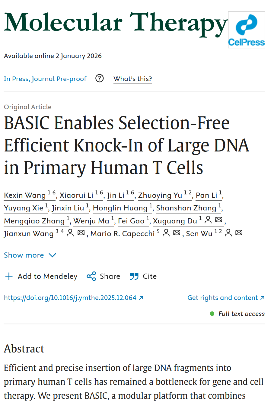 Recently,an important research achievement, entitled 《BASIC Enables Selection-Free Efficient Knock-In of Large DNA in Primary Human T Cells, has been published online in 《Molecular Therapy the internationally authoritative journal of gene and cell therapy. This study proposes a groundbreaking gene-editing platform BASIC, which provides a novel solution for the engineering and scaling of next-generation cell therapies.