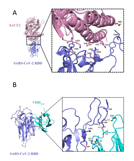 In order to explore the structural basis of VHH5-05 blocking the interaction between SARS-CoV-2 RBD and ACE2, the structure of VHH5-05 and RBD complex was simulated, and the binding epitopes were compared with the RBD-HACE2 complex. The homology model of VHH5-05 was established through SWISS-model online server, and molecular docking was carried out with MOE software to simulate protein interaction. The protein-protein docking module in Dock package was used to realize docking calculation between RBD and VHH5-05. The receptor‑binding motif (RBM) of SARS-CoV-2 was 437-508 aa. The key amino acids that interact with RBM in hACE2 are K31, E35, D38, M82 and K353. The amino acids corresponding to SARS-CoV-2 are L455, F486, Q493, S494, N501 and Y505. Modeling analysis results showed that most residues on the epitopes of RBD-VHH5-05 overlapped with the binding interface of RBD-ACE2, especially the key loci F486, Q493 and S494 of SARS-CoV-2 RBD participated in its binding with VHH5-05. This also again supports the research conclusion that the nanoantibody can effectively block the binding of RBD-ACE2.