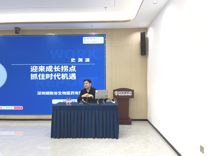 In order to thoroughly implement the future work deployment of Shenzhen Cell Valley and its subsidiaries, clarify work objectives, gather development consensus, and help the company and employees develop together, on the afternoon of October 30, 2023, the group held a general meeting of all employees, and the founder Chairman Shi Yuanyuan made a keynote report on the topic of "ushering in the growth turning point and seizing the opportunities of The Times". Wang Jianxun, Deputy general manager and chief scientist of the Group, Xiang Hua, Tang Xiaomeng, and all employees of Shenzhen headquarters and wholly-owned subsidiaries Junhou Biology and Jingshen Cell Valley participated in the meeting through online and offline means.