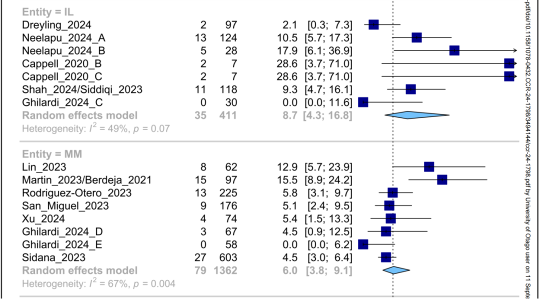 研究人员在MEDLINE、Embase和 Cochrane Library CENTRAL数据库中进行了文献检索,随后筛选了FDA批准的六种治疗多发性骨髓瘤和淋巴瘤的CAR-T细胞产品的所有临床研究,包括:axi-cel,tisa-cel,ide-cel,cilta-cel,liso-cel,brexu-cel。结果如下: