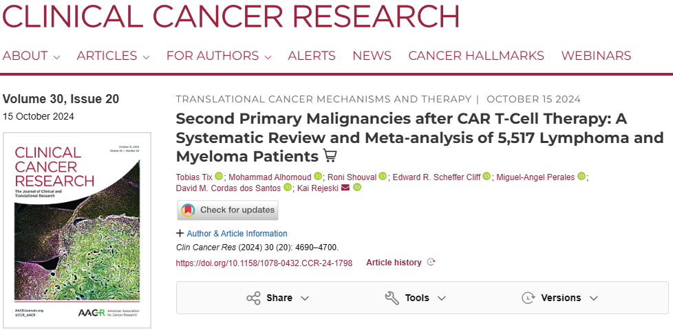 [2] Tobias Tix, Mohammad Alhomoud, Roni Shouval, Edward R. Scheffer Cliff, Miguel-Angel Perales, David M. Cordas dos Santos, Kai Rejeski; Second Primary Malignancies after CAR T-Cell Therapy: A Systematic Review and Meta-analysis of 5,517 Lymphoma and Myeloma Patients. Clin Cancer Res 15 October 2024; 30 (20): 4690–4700.