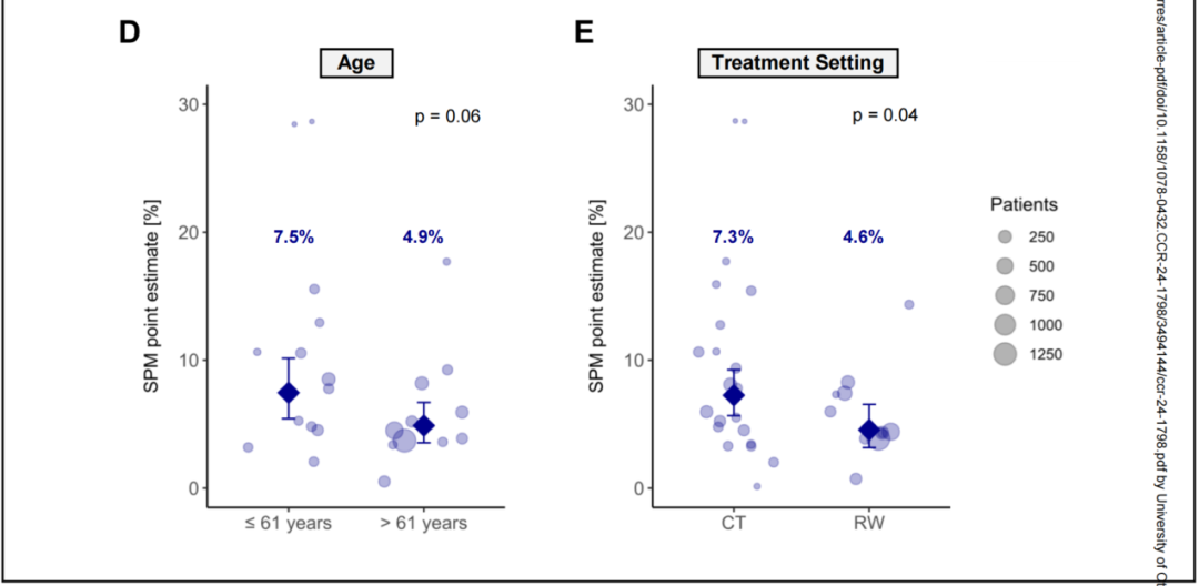 (1)研究人员从18项clinical trials (CT)和7项real- world studies(RWS)中确定了5517名患者的326种SPM。中位随访21.7个月,总体SPM点估计(point estimate)为6.0%(95% CI 4.7-7.2),如图1所示。