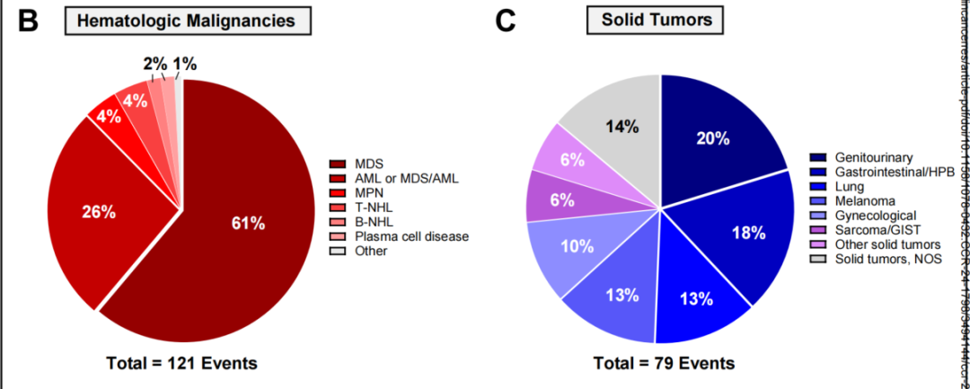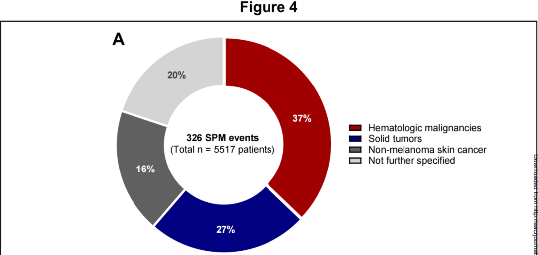 (4)在SPM亚型的分布分析中,最常见的是血液系统恶性肿瘤(121例,37%),其次是实体瘤(79例,27%)和非黑色素瘤皮肤癌(61例,16%),FDA关注的T细胞恶性肿瘤仅占事件的一小部分(5例,1.5%),如图4所示。