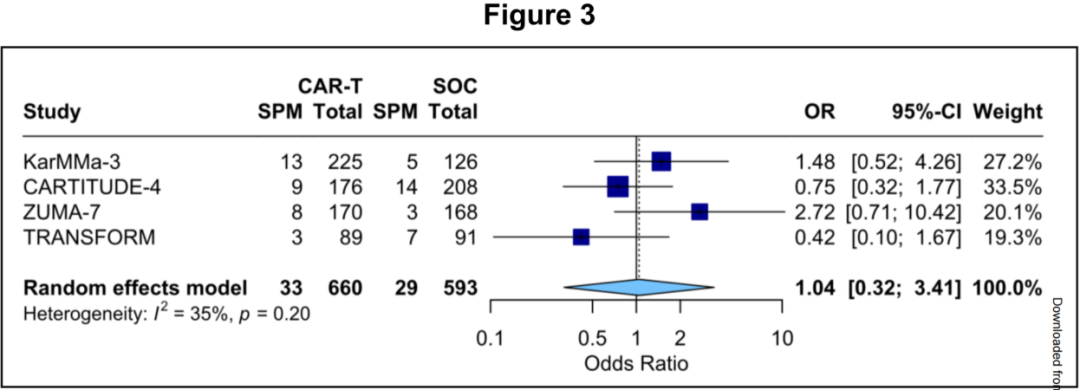 (3)如图3所示,CAR-T治疗与标准治疗的分析结果显示,两种治疗策略的SPM风险相似(P = 0.92)。