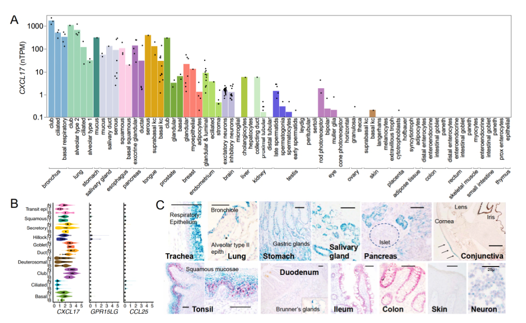 CXCL17已被证实粘膜组织中存在表达,但其在不同器官中的全面表达模式尚不完全清楚。为了填补这一空白,研究人员利用人类蛋白质图谱数据库的数据,分析了CXCL17在多种上皮细胞中的表达情况,结果显示CXCL17在呼吸道、食道、胃、胆管等多种粘膜组织中的上皮细胞存在广泛表达,尤其在气道上皮细胞中的表达量最高。此外,CXCL17也在中枢神经系统的神经元中表达,但在胶质细胞中表达较低。这一结果得到了RNAscope和免疫组化实验的证实。总体而言,这一结果与对CXCL17的功能预测结果相符合,并提示GPR25- CXCL17轴可能在CNS的免疫调节中发挥作用。