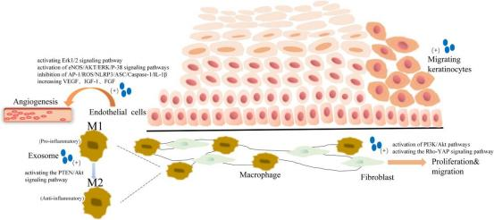 除了高血糖导致的血液循环障碍、细菌滋生和免疫力下降之外,糖尿病患者还常常遭遇伤口愈合缓慢的问题。在《Diabetes Research and Clinical Practice》杂志上发表的一项研究深入探讨了外泌体在促进糖尿病伤口愈合过程中的关键作用,包括其在血管生成、胶原合成和炎症抑制方面的潜在应用。该文献详细阐述了外泌体如何顺利获得调节特定功能分子的表达,影响内皮细胞(ECs)、成纤维细胞、巨噬细胞和角质形成细胞等关键细胞类型,进而有助于糖尿病伤口的愈合进程。此外,外泌体在细胞间通信中的作用也不容忽视,它们能够携带蛋白质、脂质、RNA和DNA等信息货物,实现细胞间的信息研讨。值得注意的是,糖尿病伤口的皮肤组织往往承受着更为严重的氧化应激,这种高氧化应激状态可能导致细胞内的蛋白质、脂质和DNA受损,引起细胞死亡和组织功能障碍 ,最终影响伤口的愈合。外泌体顺利获得降低氧化应激水平,发挥了持续作用。特别是那些过表达核因子-E2相关因子2(Nrf2)的ADSC衍生外泌体,已被证实能够减少炎症和氧化应激相关蛋白的表达水平,并有效促进了糖尿病大鼠模型中的伤口愈合。这表明外泌体不仅能抑制过度炎症的发生,避免其对伤口愈合的不利影响,而且还能顺利获得多种机制显著促进糖尿病性伤口的愈合过程。这些发现为糖尿病伤口治疗给予了新的策略和潜在的治疗靶点[2]
