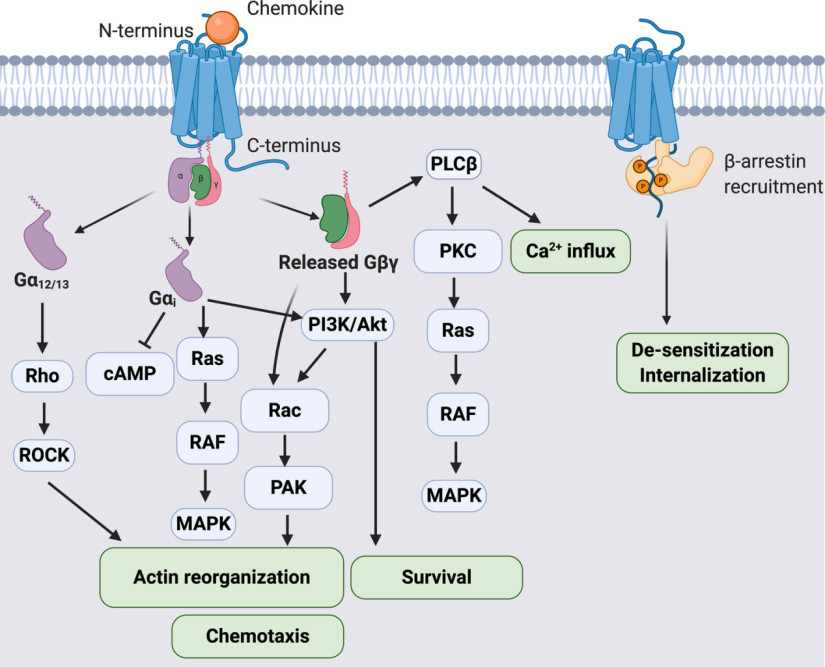 趋化因子受体是具有配体结合N端和7个跨膜结构域的G蛋白偶联受体(GPCRs)。一旦与相应的趋化因子配体结合,细胞内的G蛋白构象就会发生变化,与受体分离,导致Gα-ATP复合物和Gβγ异源二聚体的释放,如图2所示。大多数趋化因子受体与Gαi亚基偶联,但也可以顺利获得其他Gα蛋白发出信号,如Gα12/13、Gαs和Gαq。一旦被激活,Gαi亚基可以抑制cAMP的产生,诱导Ras/RAF/MAPK信号通路,以及PI3K/Akt通路。细胞迁移的主要调控因子是释放的Gβγ异源二聚体,它不仅激活PI3K/Akt通路控制肌动蛋白重组,还顺利获得PLC调控Ca2+动员和MAPK信号传导。Gβγ异源二聚体也参与了β-抑制素的募集,这对趋化因子受体的脱敏和内化至关重要。